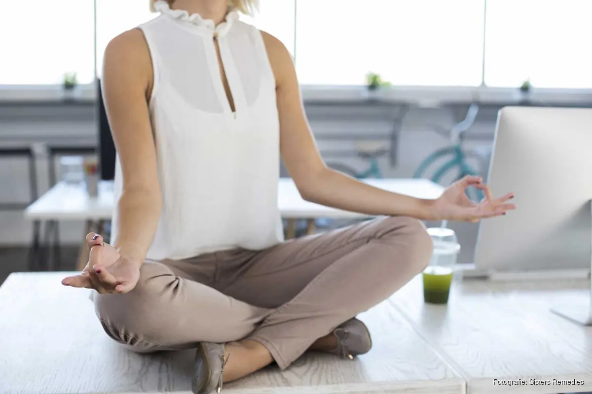 Zit je nog steeds een stukje van je bureau af? Mooi zo. Zorg ervoor dat je voeten goed contact maken met de vloer. Leg beide handen te rusten op je bovenbenen.